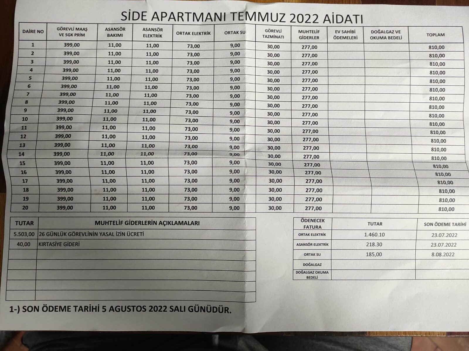 İstanbul’da 20 dairelik sıradan bir apartmanda aylık aidat 800 lirayı buluyor. Tek apartmana bakan kapıcıların maliyeti, 20 daire için aylık 429 TL’yi buldu. 399 TL maaş ve SGK primine, 30 TL tazminata ödeniyor. 20 dairelik örnek bir apartmanda bir daire için Temmuz ayı aidatının dökümü şöyle:
