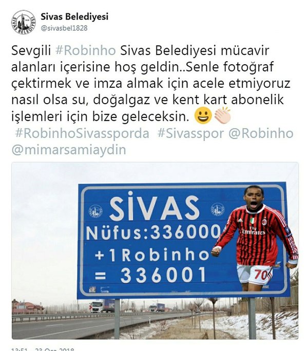 Mesajda, "Sevgili Robinho, Sivas Belediyesi mücavir alanları içerisine hoş geldin. Seninle fotoğraf çektirmek ve imza almak için acele etmiyoruz. Nasıl olsa su, doğal gaz ve kentkart abonelik işlemleri için bize geleceksin." ifadelerine yer verildi.