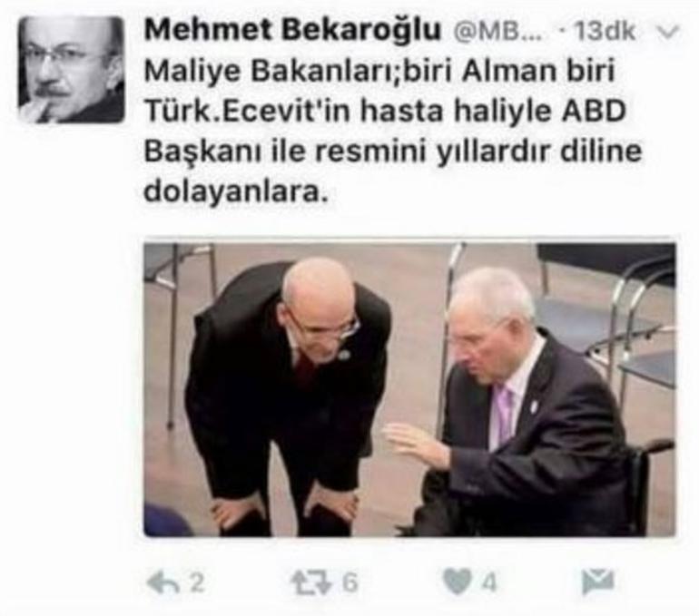 Başbakan Yardımcısı Mehmet Şimşek'in, Almanya Maliye Bakanı Wolfgang Schauble ile çekilmiş bir fotoğrafını Twitter adresinden paylaşan CHP İstanbul milletvekili Mehmet Bekaroğlu, fotoğrafın altına, "Maliye Bakanları; biri Alman biri Türk. Ecevit'in hasta haliyle ABD Başkanı ile resmini yıllardır diline dolayanlara" diye yazdı.