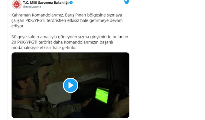 Terörle mücadele kapsamında Barış Pınarı bölgesine saldırı ve sızma girişiminde bulunan 20 PKK/YPG'li terörist etkisiz hale getirildi.