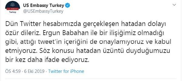 ABD Ankara Büyükelçiliğinin Twitter hesabından yapılan açıklamada, "Dün Twitter hesabımızda gerçekleşen hatadan dolayı özür dileriz.