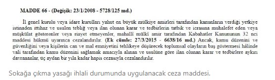 TCK’nın 195’inci maddesinde “Bulaşıcı hastalıklardan birine yakalanmış veya bu hastalıklardan ölmüş kimsenin bulunduğu yerin karantina altına alınmasına dair yetkili makamlarca alınan tedbirlere uymayan kişi, 2 aydan 1 yıla kadar hapis cezası ile cezalandırılır” ibaresi bulunuyor. Sokağa çıkma yasağını ihlal edenler bu yasaya göre de ceza alabilecek.