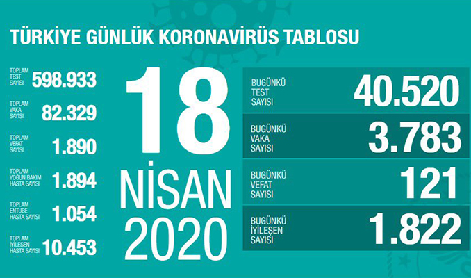 Sağlık Bakanı Fahrettin Koca, son 24 saate 121 kişinin hayatını kaybettiğini, 1822 kişinin ise iyileşerek taburcu olduğunu açıkladı. Bakan Koca, bugün 40 bin 520 korona virüs testi yapıldığını ve günlük vaka sayısının ise 3783 kişi olarak kayıtlara geçtiğini açıkladı.