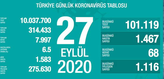 Sağlık Bakanlığı'nın Günlük Koronavirüs Tablosu'na göre Türkiye'de son 24 saatte 1467 yeni korona virüs vakasına rastlandı. Salgın nedeniyle 67 kişi daha hayatını kaybetti