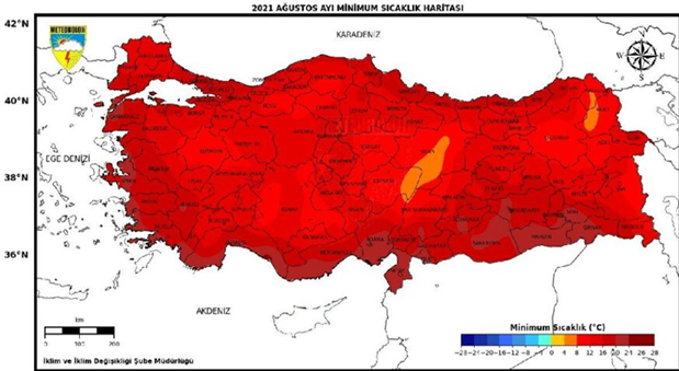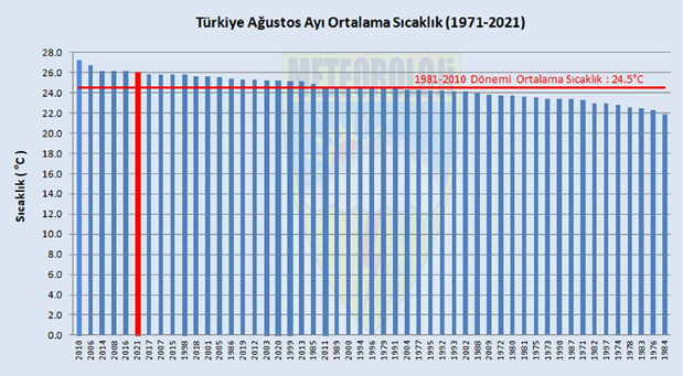 1981-2010 normalleri ile geçen yıla göre karşılaştırmaların yapıldığı bu yılın ağustos ayında, önceki aylarda olduğu gibi sıcaklıkların hem normaline hem de geçen seneye göre arttığı gözlendi. Rapora göre, 2021 yılı Ağustos ayında ortalama sıcaklıklar, yurdun batı ve güney kıyıları ile kuzey doğu kesimlerinde mevsim normallerinin üzerinde yaşandı. Diğer bölgelerde ise mevsim normalleri civarında gerçekleşti. Uzun yıllar 24,5 derece olan ağustos ayı ortalama sıcaklığı, 2021 Ağustos ayında 26 derece oldu.