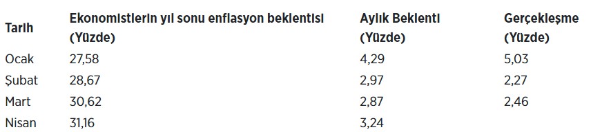 Öte yandan, ekonomistlerin 2025 sonu enflasyon beklentisi nisan ayı itibarıyla yüzde 31,16 oldu.