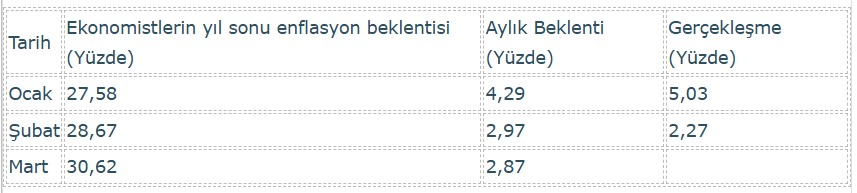 Öte yandan, ekonomistlerin 2025 sonu enflasyon beklentisi mart ayı itibarıyla yüzde 30,62 oldu.
