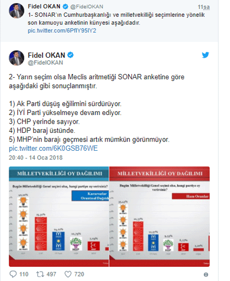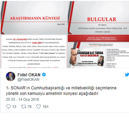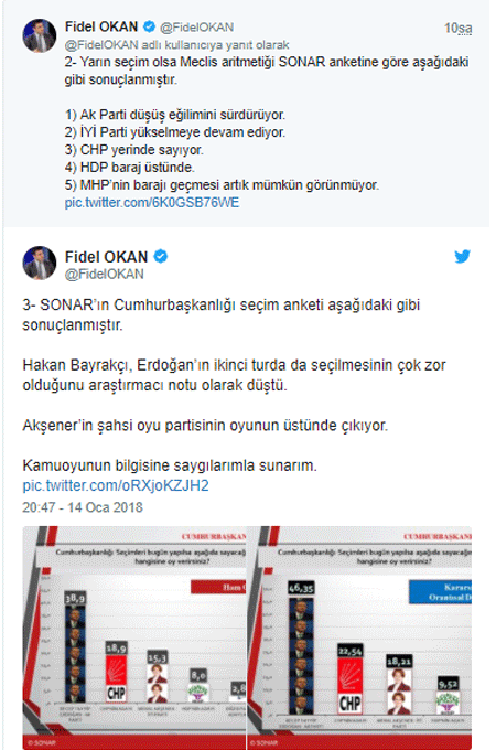 Sonarın hep aynı ayak oyunları. Bakın seçime bir gün kala gerçeklere çok yakın tahminde bulunup, basınla paylaşmayacak sonra, ben doğru tahmin ettim diyecektir. Ben şimdiden seçim sonuçlarını söyleyim. AK Parti en az %60, İYİ parti % 7, gerisi hikaye.