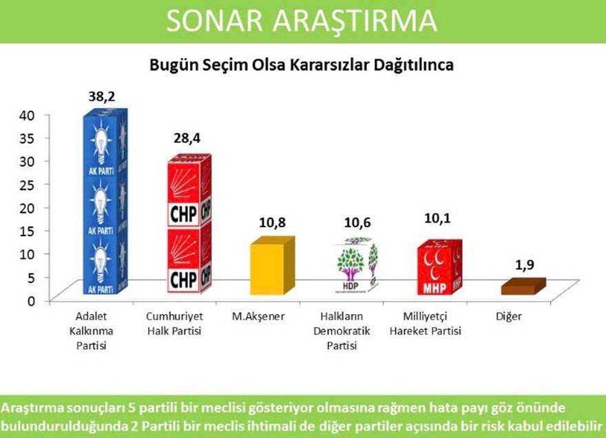 Araştırma notunda ise şöyle deniliyor: “Araştırma sonuçları 5 partili bir Meclis’i gösteriyor olmasına rağmen hata payı göz önünde bulunduruluduğunda 2 partili bir Meclis ihtimali de diğer partiler açısından bir risk kabul edilebilir.”