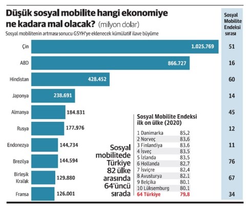 Böyle bir ivme Çin ekonomisine her yıl 103 milyar dolar olmak üzere gelecek on yılda 1 trilyon doların üzerine ek GSYH büyümesi getirirken, ABD sosyal mobilite karne notunu 10 puan yükselttiği takdirde ekonomisine - her yıl 87 milyar dolar - toplamda 866,7 milyar dolar ekleyebilir. Hindistan için bu GSYH artış potansieli 428,4 milyar dolar olarak öngörülürken, Japonya sosyal mobilite karnesini 10 puan yükselttiği takdirde gelecek on yıl boyunca GSYH büyümesine 238,7 milyar dolar ekleyebilecek.