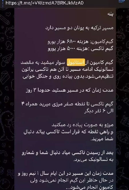 Aynı grupta bir yönetici tarafından paylaşıldığı görülen farklı bir mesajda ise, "Türkiye'den Yunanistan'a giden rota iki güzergahtan oluşuyor, TIR güzergahı: 6.800 Euro ve taksi güzergahı: 5.000 Euro. İstanbul'dan TIR güzergahına binip Selanik'e gidiyorsunuz ve yürümeden Atina'ya doğru devam ediyorsunuz" ifadeleri yer alırken mesajın devamında ise, "Türkiye-Yunanistan sınırının sıfır noktasına kadar taksi güzergahından 4-6 kişi ile gidiyorsunuz ve Türkiye-Yunanistan sınırını yaya olarak geçiyorsunuz ve taksinin olması gereken noktada sizi almasını bekleyeceksiniz ve taksi sizi alıp Selanik şehrine götürecek" ifadeleri yer aldı.