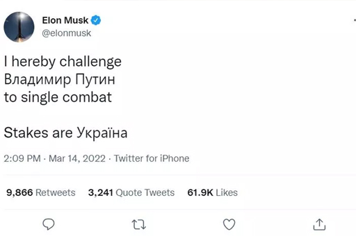 Sosyal medya platformu Twitter'dan Putin’e seslenen Elon Musk “Vladimir Putin’i teke çıkmaya davet ediyorum. Bahisler Ukrayna için” yazdı.