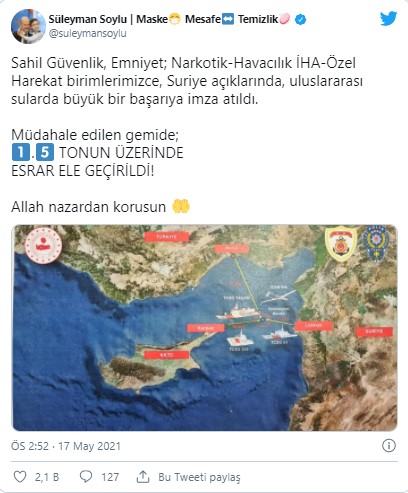 İçişleri Bakanı Süleyman Soylu, Suriye açıklarında müdahale edilen bir gemide 1,5 tonun üzerinde esrar ele geçirildiğini bildirdi.