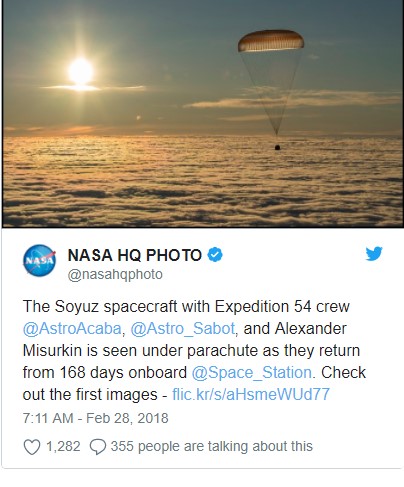 İki Amerikalı astronot ve Rus kozmonottan oluşan mürettebat 3 buçuk saat süren yolculuğun ardından dünyaya vardı.