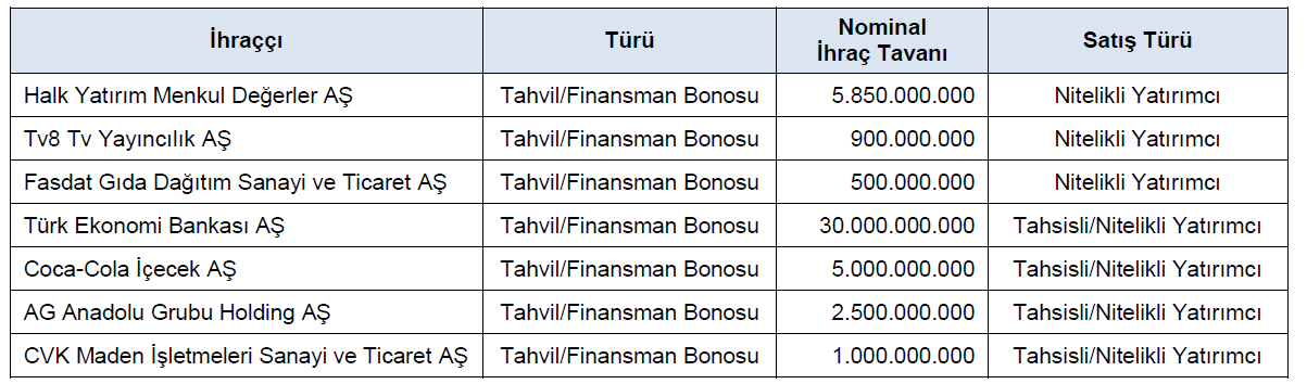 Sermaye Piyasası Kurulu (SPK) tarafından yayımlanan haftalık bültende 7 şirketin tahvil ihraçlarına ilişkin onaylar yer aldı.