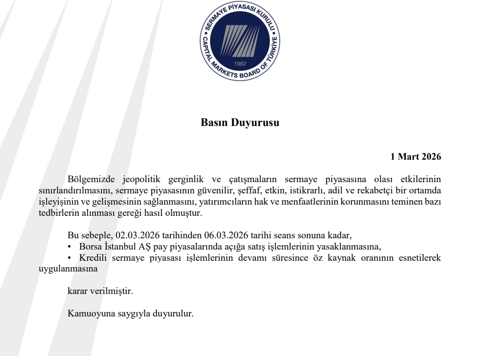 SPK açıklamasında, "Borsa İstanbul AŞ piyasalarında gerçekleşen gelişmeler dikkate alınarak, sermaye piyasalarının güvenilir, şeffaf, istikrarlı bir ortamda işleyişinin sağlanması ile yatırımcıların hak ve yararlarının korunmasını teminen Borsa İstanbul AŞ pay piyasalarında açığa satış işlemlerinin 2 Mart 2026 tarihinden 6 Mart 2026 seans sonuna kadar yasaklanmasına karar verilmiştir." ifadelerine yer verildi.