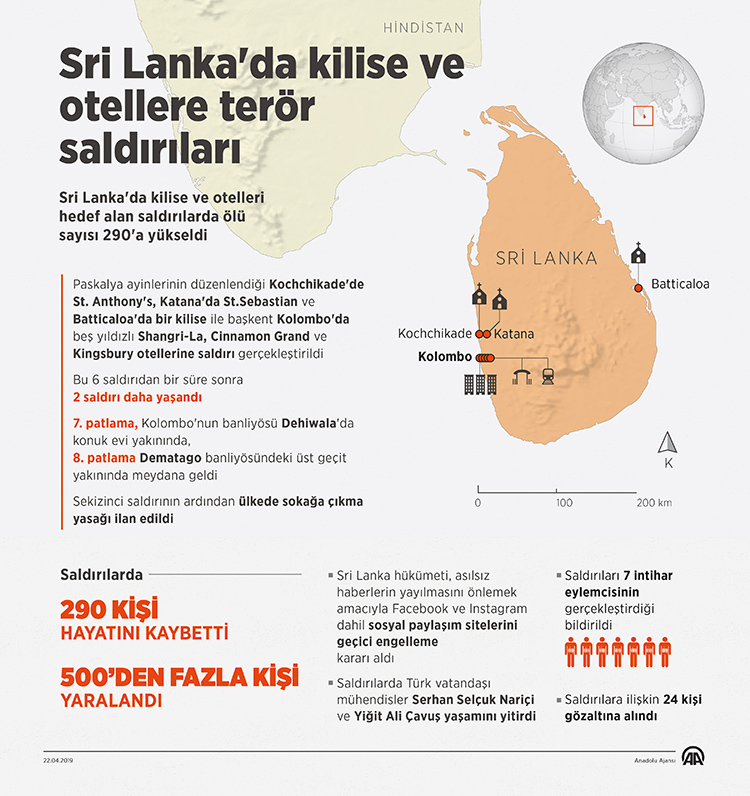 Sri Lanka'da Adli Tıp Kurumu yetkilisi Ariyananda Welianga, dün sabah saatlerinde Kochchikade'de St. Anthony, Katana'da St. Sebastian ve Batticaloa'daki Meryem Ana Kilisesi ile başkent Kolombo'da beş yıldızlı Shangri-La, Cinnamon Grand ve Kingsbury otellerine düzenlenen 6 bombalı saldırıyı 7 intihar bombacısının gerçekleştirdiğinin belirlendiğini açıkladı.
