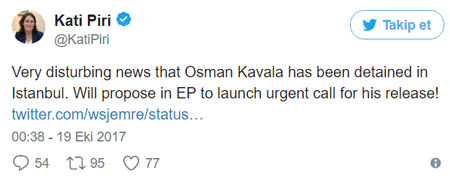 Avrupa Parlamentosu Türkiye Raportörü Kati Piri ise Kavala'nın gözaltına alınmasının ardından Twitter'dan paylaştığı mesajda "Osman Kavala'nın İstanbul'da gözaltına alınması çok rahatsız edici. Avrupa Parlamentosu'nda serbest bırakılması için acil çağrı başlatılmasını teklif edeceğim" ifadelerini kullandı.