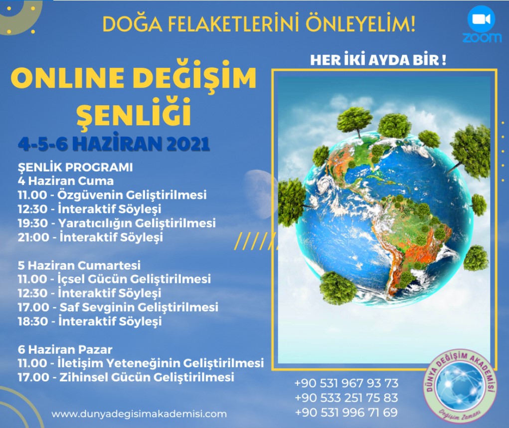 Dünya Değişim Akademisi tarafından her iki ayda bir gerçekleştirilen Değişim Şenliği, Kovid-19 nedeniyle alınan önlemler kapsamında, 4-5-6 Haziran tarihlerinde tüm dünyaya online olarak sunulacak.