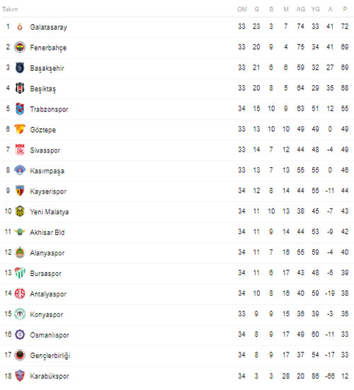 Galatasaray yenilirse, buna Başakşehir'in olası bir puan kaybı eklenirse Fenebahçe'nin şampiyonluğu için Konyaspor maçında galibiyet yeterli olacak. Galatasaray yenilip, Başakşehir Kasımpaşa'ya karşı kazanırsa bu durumda Fenerbahçe'nin aldığı sonuca bakmaksızın şampiyon Başakşehir olacak.