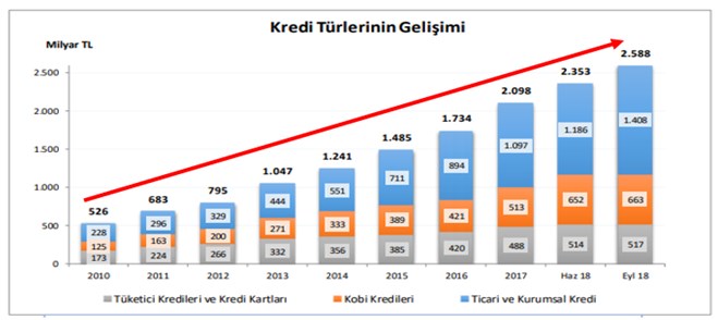 Bankacılık Denetleme ve Düzenleme Kurulu (BDDK) verilerine göre Eylül 2018 dönemi itibariyle verilmiş bulunan 2.588 Milyar TL tutarındaki kredilerin, 1.492 milyar TL’si (% 58) Türk parası kredilerden, 1096 milyar TL’si (%42) yabancı para kredilerden oluşmaktadır. Kredilerin türlerine bakıldığında ticari ve kurumsal kredilerin payının % 54, KOBİ kredilerinin payının % 26 ve tüketici kredilerinin (kredi kartları dahil) payının ise % 20 olduğu görülmektedir. Aşağıda yer alan grafikten de anlaşılacağı üzere kredi hacmi son 8 senede yaklaşık olarak 5 katına çıkmıştır.