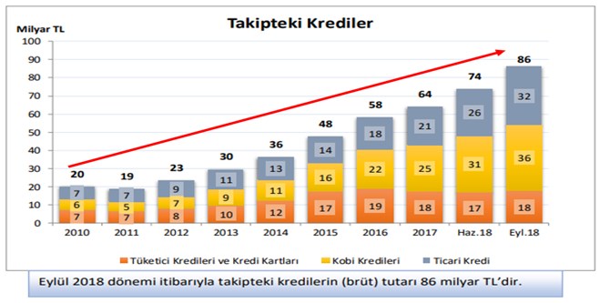 Verilen kredilerin ne kadarının takibe alındığı incelendiğinde ise Eylül 2018 dönemi itibarıyla takipteki kredilerin (brüt) tutarının 86 milyar TL’ye ulaştığı ve bunun toplam kredi hacminin % 3,2’sine tekabül ettiği görülmektedir. Yine aşağıda yer alan grafikten de anlaşılacağı üzere takipteki kredilerin tutarı son 8 senede yaklaşık olarak 4,5 katına çıkmıştır.
