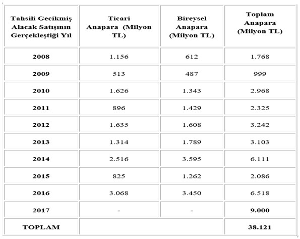 Varlık Yönetim Şirketleri Derneği verilerine göre, bankaların 2017 yılında 9 milyar TL tutarında sorunlu alacak satışı gerçekleştirdiği, bunun 2016 yılındaki 6,4 milyar TL’lik tahsili gecikmiş alacak portföyü satışına göre % 30’un üzerinde bir artış manasına geldiği ve bunun şimdiye kadar gerçekleştirilmiş en yüksek tutar olduğu anlaşılmaktadır.