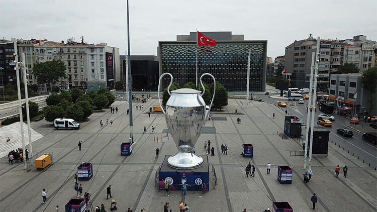 Şampiyonlar Ligi final karşılaşması öncesinde Taksim Meydanı'na dev Şampiyonlar Ligi kupası yerleştirildi.