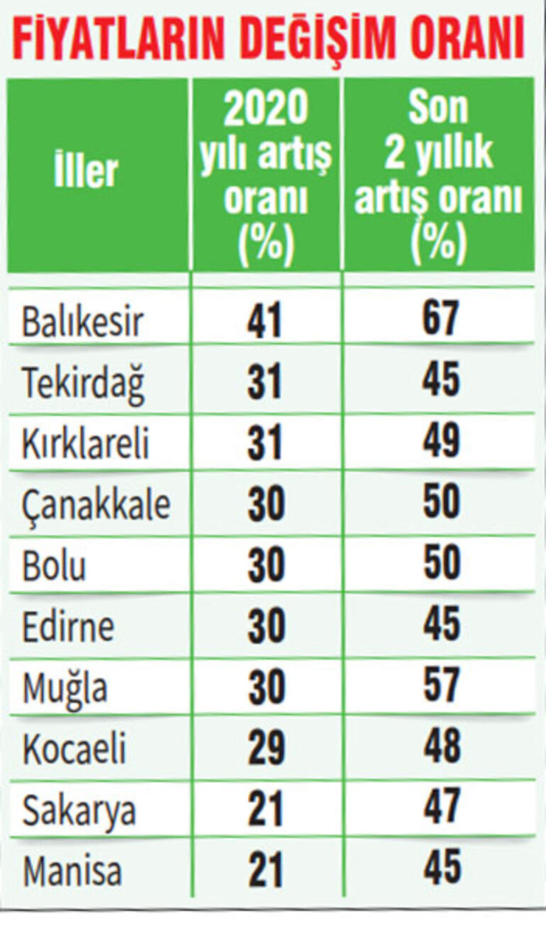 Arsa yatırımı yapmak ve kendi konutunu inşa etmek isteyenler genellikle İstanbul ve İzmir’e yakın illeri tercih ediyor. Otoyolların da etkisiyle, pek çok şehirde arayış var. Balıkesir’den Muğla’ya, Çanakkale’den Manisa’ya kadar arazi fiyatlarında yıllık yüzde 50’ye varan fiyat farkları görülüyor.