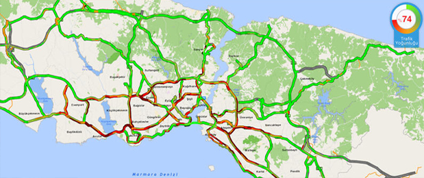 İstanbul Büyükşehir Belediyesi'nin mobil uygulamasına göre, kent genelinde trafik yoğunluğu saat 13.00 sıralarında yüzde 74 olarak ölçüldü.
