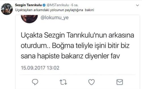 Ankara’dan İstanbul’a uçakla yolculuk eden Tanrıkulu dün, 1A numaralı koltuğa oturdu. Tanrıkulu’nun arkasındaki 2A numaralı koltukta oturan Gazi Üniversitesi Hukuk Fakültesi Araştırma Görevlisi Burak Doğan, Twitter’da kullandığı “@lokumu_ye” hesabından “Uçakta Sezgin Tanrıkulu’nun arkasına oturdum.. Boğma teliyle işini bitir biz sana hapiste bakarız diyenler fav” mesajını paylaştı.