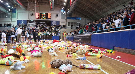 İzmit Belediyespor'un Atatürk Spor Salonu'nda Kırklareli Basketbol ile oynadığı Türkiye Kadınları Basketbol Ligi maçında tribünlerden yüzlerce oyuncak sahaya atıldı.
