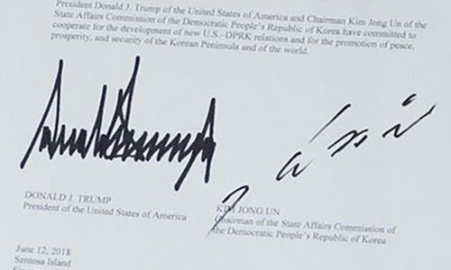 Habertürk Gazetesi'nin haberine göre Jong-un, imza töreninde “Burada tarihi bir buluşmaya tanık oluyorsunuz. Geçmişi geride bırakmaya karar verdik. Dünya büyük değişime tanık olacak” dedi.