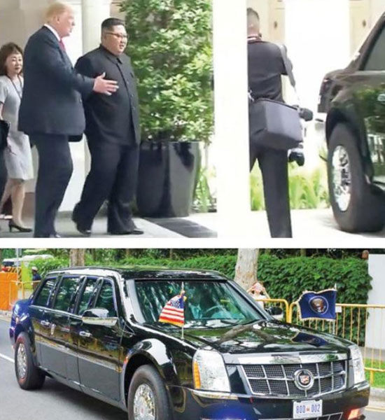ABD Başkanı Donald Trump, öğle yemeğinden sonra Kim Jong-un ile otel dışına çıkıp ona 2 milyon dolar değerindeki ‘Canavar’ lakaplı başkanlık makam aracının içini gösterdi. Kapının önündeki limuzinin yanına kadar gelen ve aracın içine bir süre bakan ikili daha sonra geri dönerek sohbetlerine devam etti. Trump’ın hevesli tavrının yanında Kim Jong-un’un araca fazla yaklaşmaması dikkat çekti. Dünyanın en güvenli araçlarından biri olan ‘Canavar’ 8 ton ağırlığında. Otomobilin kapıları, 20 santimetre kalınlığında zırhtan oluşuyor. Aracın gövdesi ise 15 santimlik zırhla kaplı.