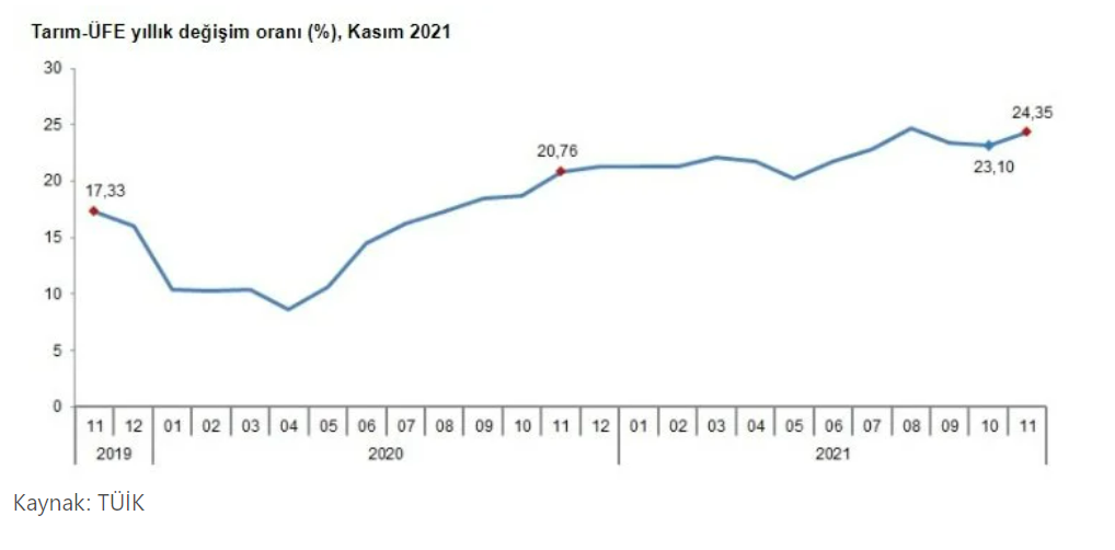 Türkiye İstatistik Kurumu (TÜİK) tarafından yapılan açıklamaya göre, Tarım-ÜFE'de (2015=100), 2021 yılı Kasım ayında bir önceki aya göre %4,57, bir önceki yılın Aralık ayına göre %21,22, bir önceki yılın aynı ayına göre %24,35 ve on iki aylık ortalamalara göre %22,36 artış gerçekleşti.