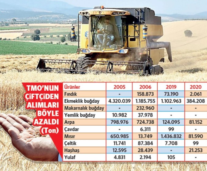 2006-2020 yıllarını kapsayan faaliyet raporlarındaki verilere göre TMO, 2006 yılında tarımsal ürün alımlarının yüzde 99.9'unu yurtiçindeki çiftçiden yapıyordu. Ancak 2020 yılına gelindiğinde durum tersine döndü, TMO'nun çiftçiden aldığı ürün oranı yüzde 19'a düştü. Buna karşılık 2006'da yüzde 0.1 olan ithal tarımsal ürün alımı 2020'de yüzde 81'e fırladı. TMO, 2005 yılında çiftçiden 4.3 milyon ton, 2006 yılında da 1.2 milyon buğday aldı. Ancak 2020'de çiftçiden aldığı buğday 384 bin tona kadar düştü. Buna karşılık TMO'nun 2020'de ithal ettiği buğday miktarı iç alımın yaklaşık 10 katına ulaşarak 3.7 milyon tona çıktı. Bu seyir arpa dahil birçok üründe yaşandı.