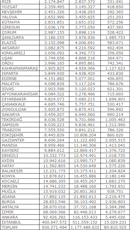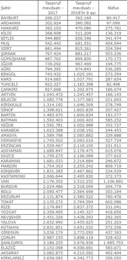 İller bazında tasarruf mevduatı ve nüfus rakamları, 2017 sonu ve 2018'in ocak-eylül dönemi itibarıyla şöyle: