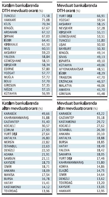 Mevduat bankalarında ise toplam mevduat içinde DTH mevduatı oranı yüzde 36 seviyesinde. Mevduat bankalarında toplam mevduata göre oranlandığında en yüksek DTH mevduatı yüzde 67 ile yurtdışındakilerin oluyor. İkincilik ise yüzde 59,5 ile Yozgat'ta bulunurken, Aksaray'da mevduat bankalarında DTH mevduatının payı yüzde 58,15 ile ikinci sırada bulunuyor. Nevşehir'de yüzde 57,3, Kırşehir'de yüzde 55,1, Gümüşhane'de ise yüzde 53,6 mevduat bankalarındaki DTH mevduatı oranı. Katılım bankalarında DTH mevduat oranı yüzde 71'i aşarak birinci sırada olan Tunceli’nin mevduat bankalarındaki DTH oranı yüzde 51,8'i buluyor. Mevduat bankalarında DTH mevduatının payının en düşük olduğu ile yüzde 15 ile Kastamonu, onu yüzde 22,1'lik pay ile Karabük izlerken, Ankara yüzde 23,26 paya sahip durumda. Mevduat bankalarında TL mevduatta en yüksek payı alan il yüzde 51,2 ile Ardahan. Ardahan'ın ardından yüzde 49,23 pay ile Kars, yüzde 47,95 ile Çanakkale geliyor.