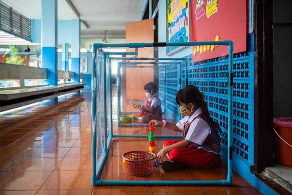 Anaokulundaki oyun alanları ise çocuklar için yeniden tasarlandı. Aralıklarla yerleştirilen şeffaf kutular çerisinde çocuklar tek başına oyun oynuyor.