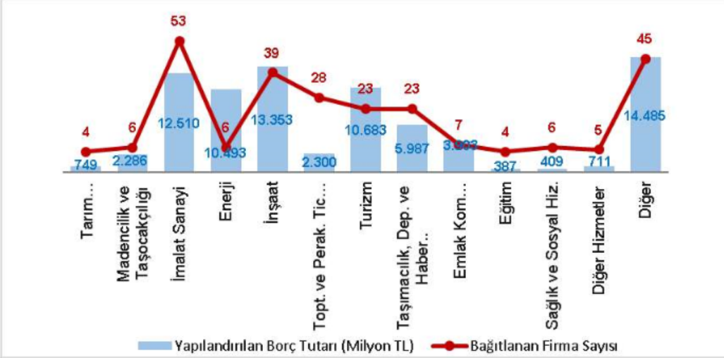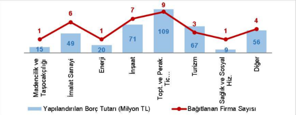 Kasım 2019- Aralık 2021 dönemi içinde, 15 milyon TL’si madencilik ve taş ocakçılığı, 49 milyon TL’si imalat sanayi, 20 milyon TL’si enerji, 71 milyon TL’si inşaat, 109 milyon TL’si toptan ve perakende ticaret, motorlu araçlar servis hizmetleri ile kişisel ve hane halkı ürünleri, 67 milyon TL’si turizm, 9 milyon TL’si sağlık ve sosyal hizmetler ve 56 milyon TL’si diğer sektörlere ait olmak üzere yeniden yapılandırılan toplam borç tutarı 396 milyon TL’dir.