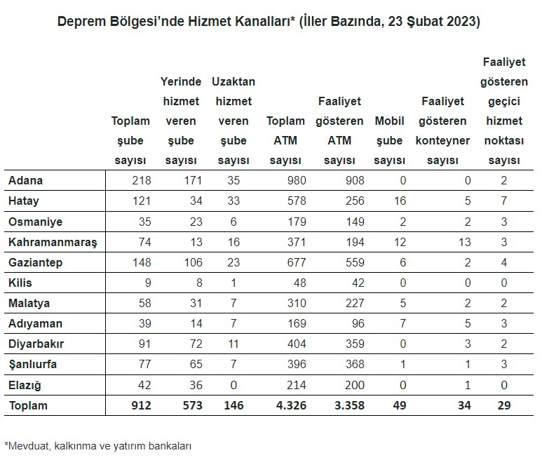 Son İki Hafta: 10 - 23 Şubat arasında (Elazığ’da hizmet veren 36 şube ve 200 ATM verisi 17 Şubat itibarıyla dahil edilmiştir) ise toplam 337 şube, 590 ATM ve 112 adet mobil/konteyner şube veya geçici hizmet noktası devreye girmiştir.