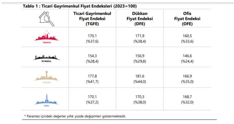 Endeks değerleri, bir önceki yılın aynı çeyreğine göre İstanbul, Ankara ve İzmir’de sırasıyla yüzde 28,4, yüzde 41,7 ve yüzde 37,2 arttı.