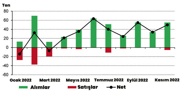 Kasım ayında Çin'i 19 tonluk alım ile Türkiye Cumhuriyeti Merkez Bankası (TCMB) ve 3 tonluk alım ile Kırgızistan Merkez Bankası takip etti.