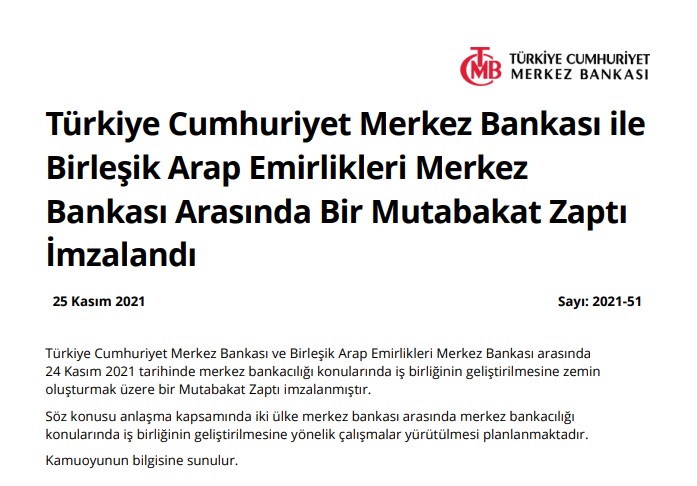 "Türkiye Cumhuriyet Merkez Bankası ve Birleşik Arap Emirlikleri Merkez Bankası arasında 24 Kasım 2021 tarihinde merkez bankacılığı konularında işbirliğinin geliştirilmesine zemin oluşturmak üzere bir Mutabakat Zaptı imzalanmıştır.