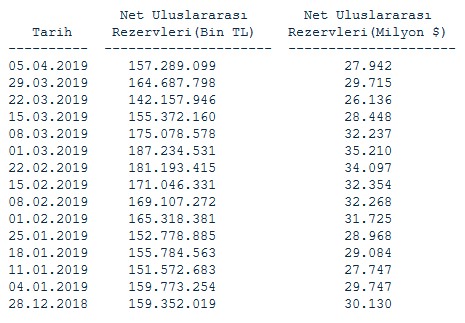 Merkez Bankası'nın net uluslararası rezervleri 5 Nisan itibarıyla27 milyar 942 dolar oldu. Merkez Bankası verilerine göre, bir önceki hafta net rezervler 29  milyar 715 milyon dolar seviyesinde bulunuyordu.