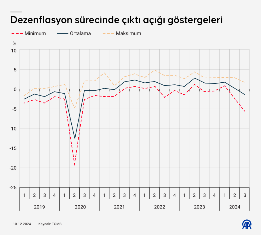 "Model ortalamalarını TCMB'nin son sıkılaştırma döngüsüne girdiği ilgili dönem itibarıyla incelediğimizde, çıktı açığının 2023 yılı ikinci çeyreğinde ulaştığı yüksek pozitif seviyelerden giderek gerilediğini görüyoruz. Bu gerilemenin, parasal sıkılaşmanın gecikmeli etkileriyle son dönemde belirginleştiği de görülmekte. Diğer yandan, farklı yöntemlerden elde ettiğimiz söz konusu göstergelerin azami ve asgari değerlerinden oluşan tahmin bandının, aşağı yönlü daha geniş olduğu gözleniyor 2023'ün son çeyreğinde takip ettiğimiz 8 göstergeden sadece biri negatif seviyedeyken 2024 3. çeyrek itibarıyla 6 gösterge negatif seviyeye gelmiş durumda. Sonuç olarak, yakın döneme ilişkin göstergeler bir bütün olarak değerlendirildiğinde, talebin yavaşlamaya devam ederek enflasyondaki düşüşü destekleyici seviyelere geldiğini ima ediyor. Sıkı para politikası sonucunda sürecek olan iç talepteki dengelenme ve önümüzdeki dönemde negatif düzeylerde gerçekleşeceği öngörülen çıktı açığı, dezenflasyon sürecinin önemli bir bileşeni olacak."