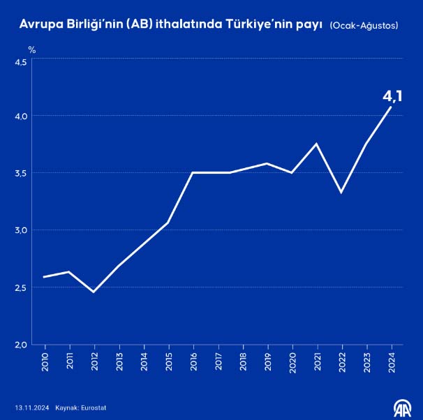 Analizde, Türkiye’nin AB’ye ihracatındaki son dönem gelişmelerin, pazar payı açısından anlamlı bir gelişime işaret ettiği aktarılarak, "Ocak-ağustos dönemleri baz alındığında, Türkiye’nin AB ithalatındaki payı son yıllarda artarak 2024 yılında yüzde 4,1 ile tarihi zirvesine çıktı." ifadeleri kullanıldı.