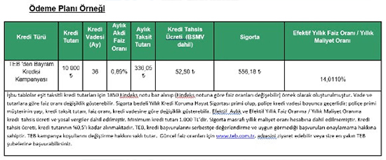 Türk Ekonomi Bankası (TEB), Kurban Bayramı’na özel kredi kampanyası başlatıyor. Yeni kampanyasıyla TEB, müşterilerinin nakit ihtiyaçlarını uygun ödeme koşullarıyla karşılayacak. Findeks notuna göre yüzde 0,89’dan başlayan ve 3 ay ile 36 ay arasında değişen vade seçenekleriyle sunulan kredi kampanyasıyla müşteriler, farklı tutarlardaki nakit ihtiyaçlarına göre değişen vade ve Findeks notuna göre değişen faiz oranından faydalanabiliyor. Kredi teklifinden yararlanmak isteyen müşteriler; TEB Şubelerinden, CEPTETEB İnternet Şubesi, CEPTETEB Mobil Uygulaması, Çağrı Merkezi ve www.teb.com.tr’den başvuru yapabiliyor.