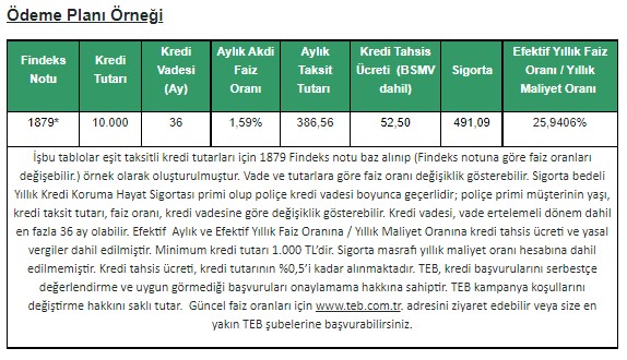 Kampanya ile ilgili konuşan TEB Bireysel ve Özel Bankacılık Kıdemli Genel Müdür Yardımcısı Gökhan Mendi, “TEB olarak müşterilerimizin finansman ihtiyacını en uygun koşullarda sağlamaları için çalışıyoruz. Bayram döneminde de ekstra nakit ihtiyacı olabileceğinden hareketle, müşterilerimizin farklı tutarlardaki kredi ihtiyaçlarını karşılamak üzere yeni bir kampanya başlattık. Müşterilerimiz yüzde 1,59’dan başlayan faiz oranı ve 3 ay ertelemeli olarak maksimum 36 aya varan vade seçenekleriyle kredi kullanabilecekler. Böylece kampanyayla müşterilerimiz, bayramda yaşayacakları olası nakit ihtiyacını TEB’in avantajlı paketiyle kolayca karşılayabilecekler” dedi.