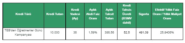Geleceğin nesillerini yetiştiren öğretmenleri 24 Kasım Öğretmenler Günü’nde de unutmayan TEB, farklı meslek gruplarındaki müşterilerinin ihtiyaç ve beklentilerine uygun özel ürün ve hizmetler sunma hedefinden yola çıkarak, öğretmenler için avantajlı bir ihtiyaç kredisini kullanıma sundu. İsteyen öğretmenler kasım ayı boyunca 1.59 faiz oranı ile avantajlı ihtiyaç kredisinden 3 ay ötelemeli olarak faydalanabilecek.